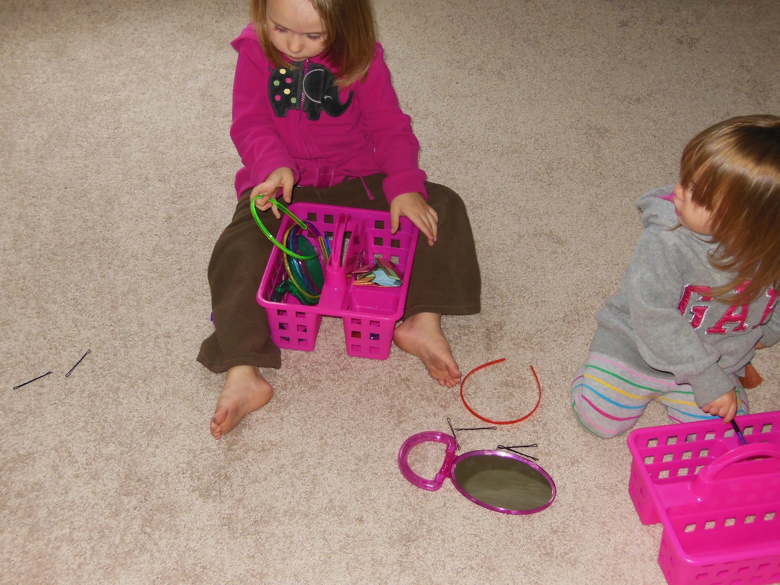 I came up with this idea because while I’m doing my makeup my girls are always playing with it or stealing it! I went to the local Dollar Tree and grabbed a few things. I bought a cute little basket, make up brush set, pack of 12 combs, pack of 6 hair bands, two hand held mirrors, and also a pack of 20 little clips. I put all this stuff into their baskets and they just loved it! They brought their basket of goodies up and down the stairs, doing their hair,tending to put on makeup. It was a big hit and now while I’m doing my makeup, they can be doing theirs. It cost me $9.00! (two mirrors, two baskets, 12 pack of combs, 20 clips, two makeup brush sets, and 6 hair bands)